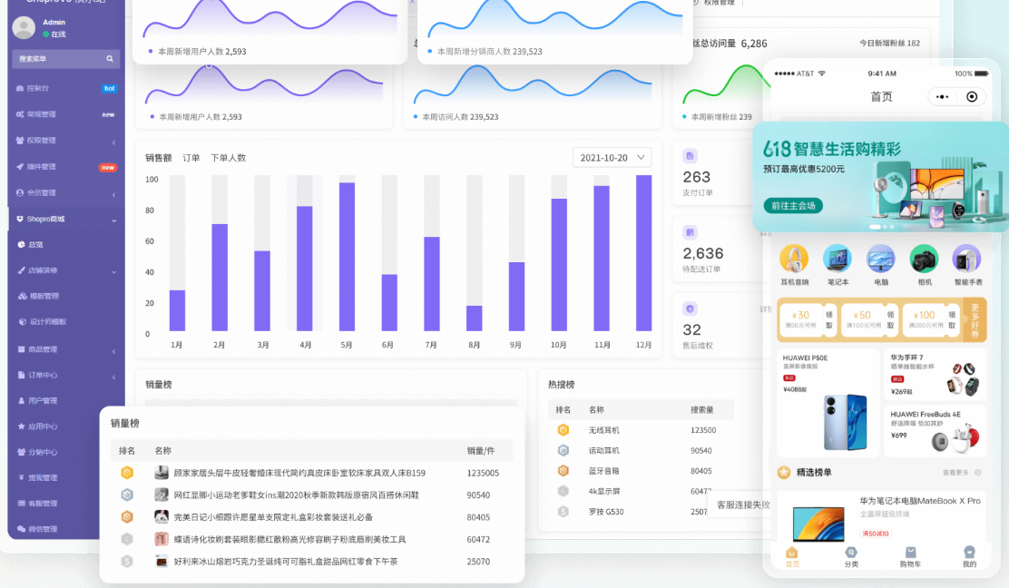 基于Fastadmin和Uniapp进行开发的多平台(微信公众号、微信小程序、H5网页、Android-App、IOS-App)购物商城,拥有强大的店铺装修、自定义模板、路由同步、多端支付(微信,支付宝)、多规格商品、运费模板、多地区邮费、库存管理、全端分享等功能。提供全部Uniapp+后台无加密源代码